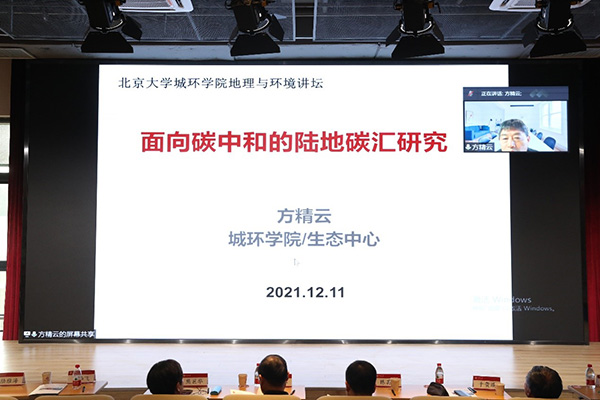 2020年9 月,习近平主席在第七十五届联合国大会提出中国将提高碳减排自主贡献力度,采取更加有力的政策和措施,二氧化碳排放力争于 2030 年前达到峰值,努力争取2060 年前实现碳中和。其后,习主席在多次重要会议上进一步强调并细化了“双碳”目标。落实双碳目标成为中国“十四五”期间经济高质量发展和生态环境高水平保护的有力抓手,也是生态文明和美丽中国建设的核心议题。围绕双碳计划目标,地理、环境科学相关的学者们进行了广泛探索,取得了诸多研究成果。为了助力碳达峰、碳中和,促进地理及环境学科的学术交流,弘扬学科特色,探索学科发展,2021年12月11-12日,色情影片 聚焦双碳计划,举办第七届色情影片 地理·环境讲坛暨第三届北大城环国际青年论坛。在严格遵守疫情防控的基础上,此次讲坛活动采取线下与线上相结合的方式,校内师生在城环新大楼现场参与讲坛活动,线上通过哔哩哔哩和蔻享学术两个平台全程实时直播,吸引了线上线下2.6万余名相关学者共襄盛会。