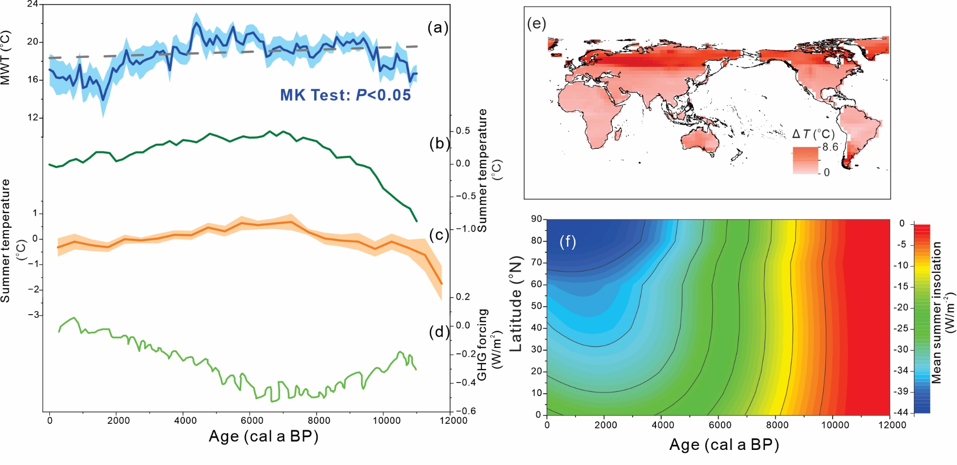 最近,色情影片 刘鸿雁教授研究团队通过利用源自地表土壤和湖泊沉积物细菌的支链四醚膜脂类化合物(brGDGT),建立了两个适用于重建全球平均暖季温度(MWT,北半球:6、7、8月的平均气温;南半球:12、1、2月的平均气温)的模型(brGDGT-MWT)。团队采用深度学习神经网络分析,将这些模型应用于覆盖全新世的全球湖泊、泥炭地和黄土剖面。研究发现,几乎所有对于MWT的重建结果与气候模式模拟(TraCE21 ka)的结果在温度变化趋势上表现出较强的一致性,亦即自全新世早期以来陆地MWT呈现降温趋势,这主要是由于北半球在全新世以来夏季太阳辐射逐渐减少(图1)。