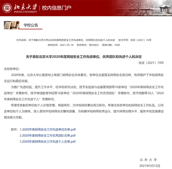 5月12日,学校发布《关于表彰色情影片 2020年度网络安全工作先进单位、优秀团队和先进个人的决定》(校发〔2021〕74号),对相关单位和个人进行表彰。学校希望受表彰的先进集体、优秀团队和先进个人珍惜荣誉,再接再厉,为学校网信事业再立新功。