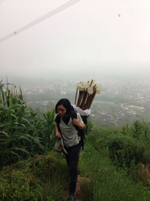 华方圆背着蜂类采集用的木棍和黄盘采集器上山