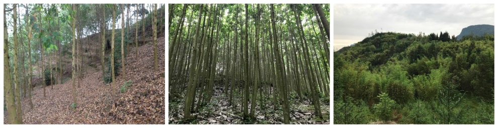 四川山区退耕还林恢复的人工林:桉树纯林(左)、厚朴纯林(中;厚朴皮是一种中药材)、竹与柳杉的混交林(右)