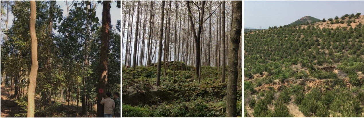 为实现生态系统服务构建的人工林:广西为生产木材栽种的桉树与本地树种混交林(左)、四川为保持土壤栽种的杨树纯林(中)、河北为涵养水源栽种的油松纯林(右)