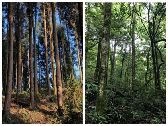 与天然林相比,人工林的森林组成和结构明显更简单:四川洪雅县境内的柳杉人工林(左)、四川大相岭省级自然保护区中的天然林(右)